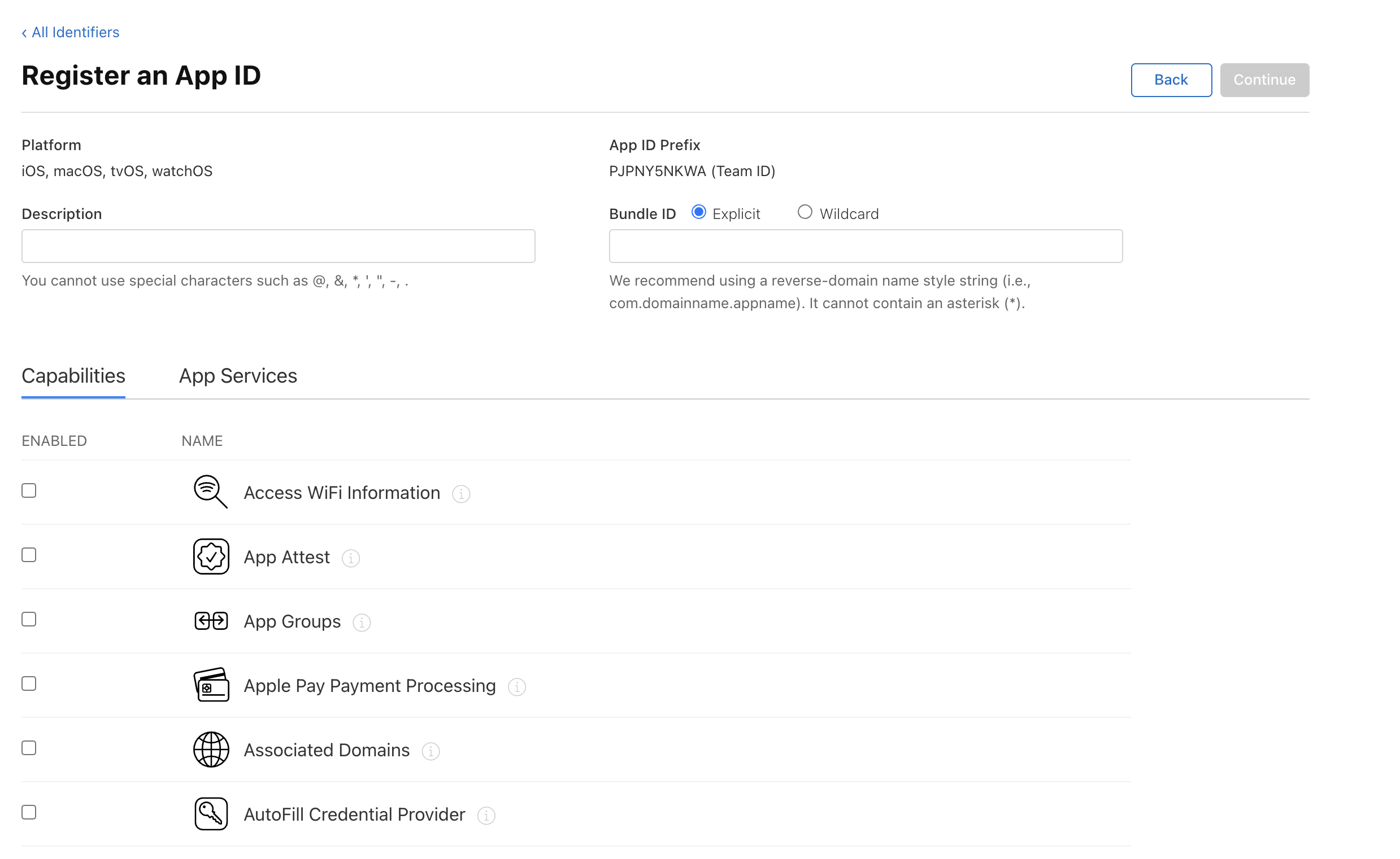 여기서 Description에는 앱 이름(영어로 하는걸 추천!), Bundle ID에는 'com.companyname.appname'와 같은 개발하고 있는 앱의 ID를 적어줍니다.