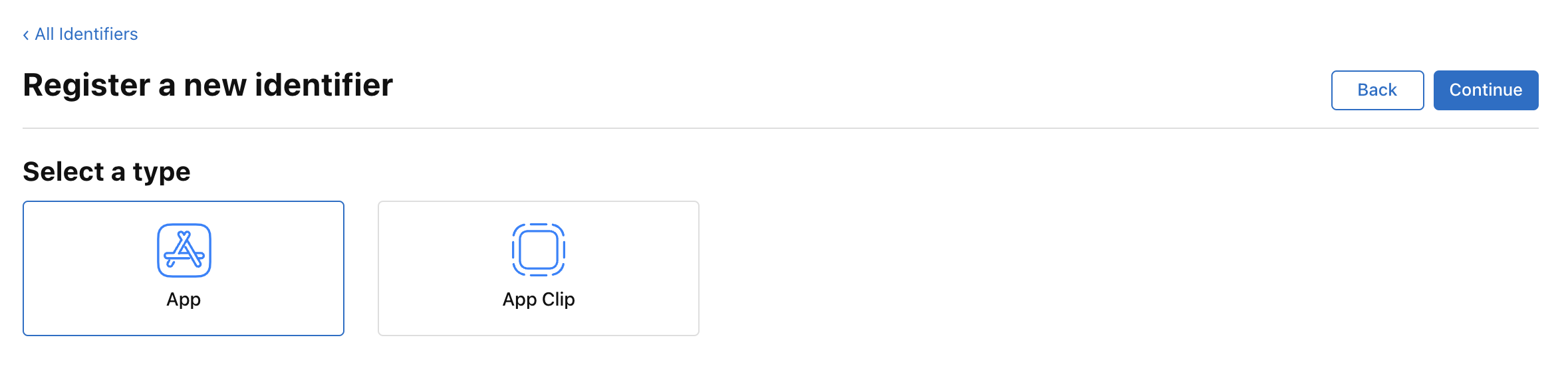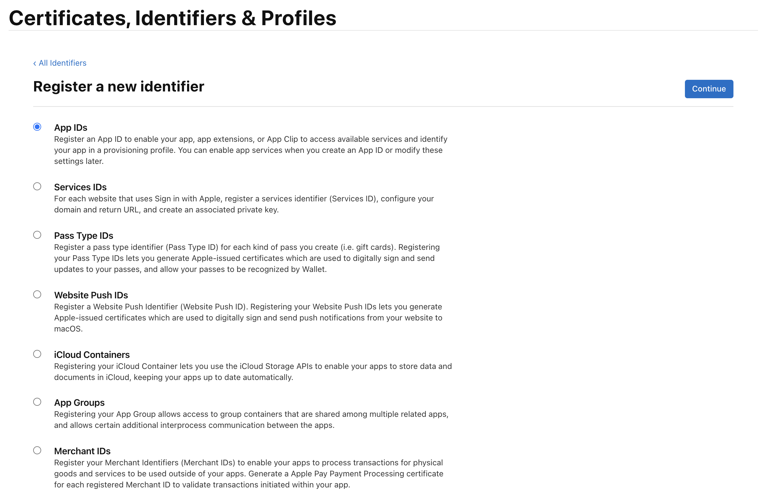 많은 ID 종류중에서 'App IDs'를 누른 후 'Continue' 버튼을 눌러줍니다.