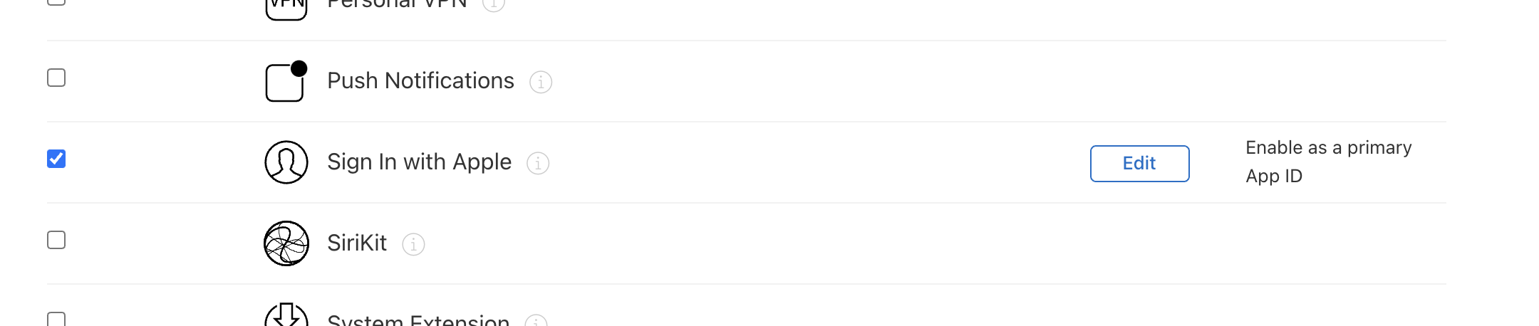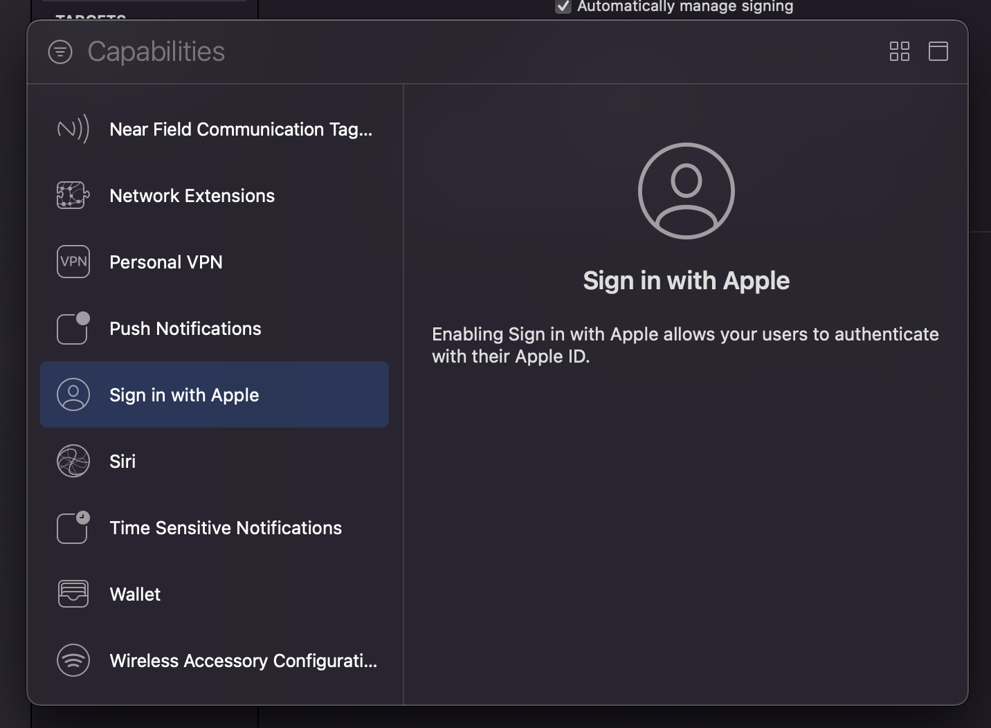 그 후 Capabilities 리스트에서 'Sign in with Apple'을 찾아 체크박스를 눌러 활성화를 진행합니다.
