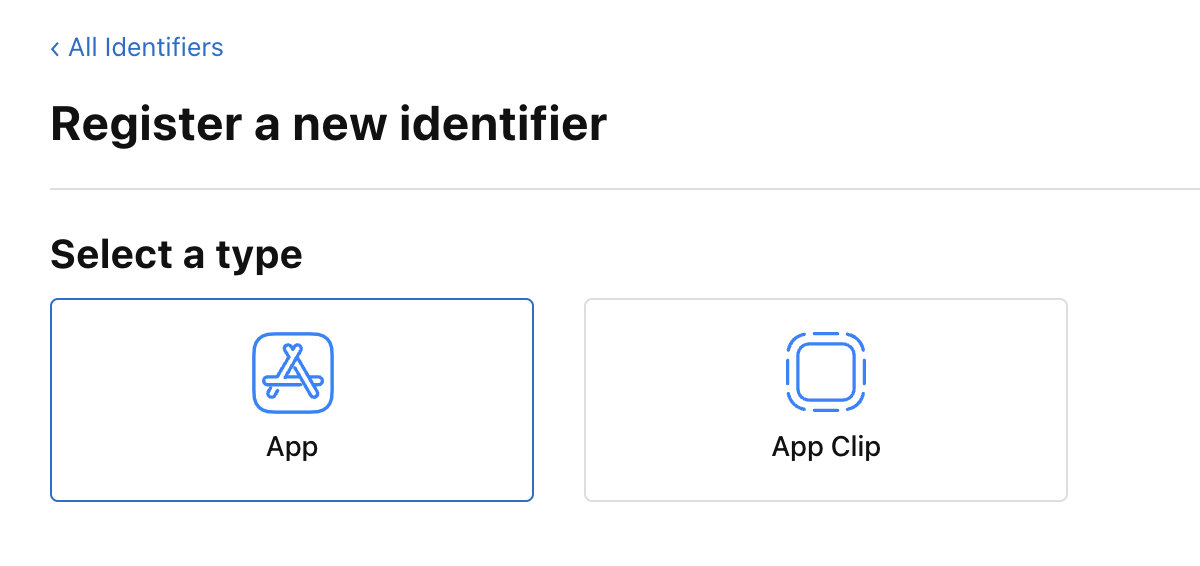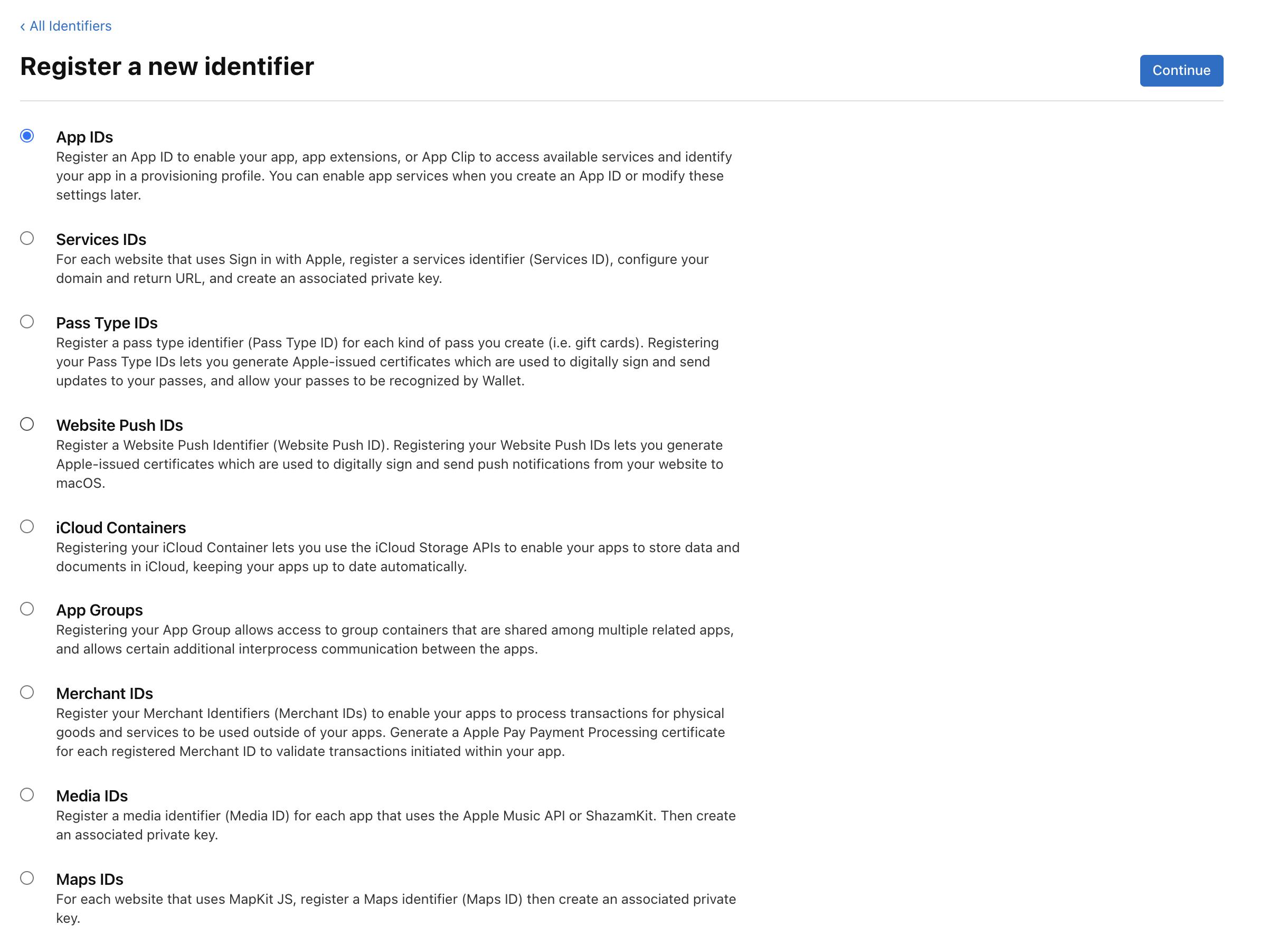 버튼을 누르면 ID의 종류를 고르는 창이 뜨게 되는데, 앱을 등록할 것이므로 'App IDs'을 체크 후 Continue 버튼을 눌러줍니다.