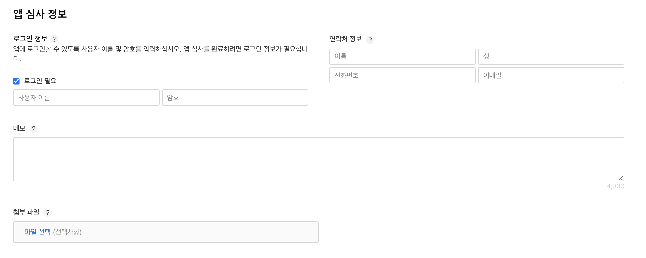 만약 앱이 실행될 때 로그인이 필요할 경우 '로그인 정보'란에 작성해주시면 됩니다. 만약 소셜 로그인만 제공할 경우, 밑 메모란에 '로그인이 필요하나 소셜 로그인만 제공해 계정 정보를 제공하지 않는 점 양해 부탁드린다'라고 작성해주시면 됩니다.