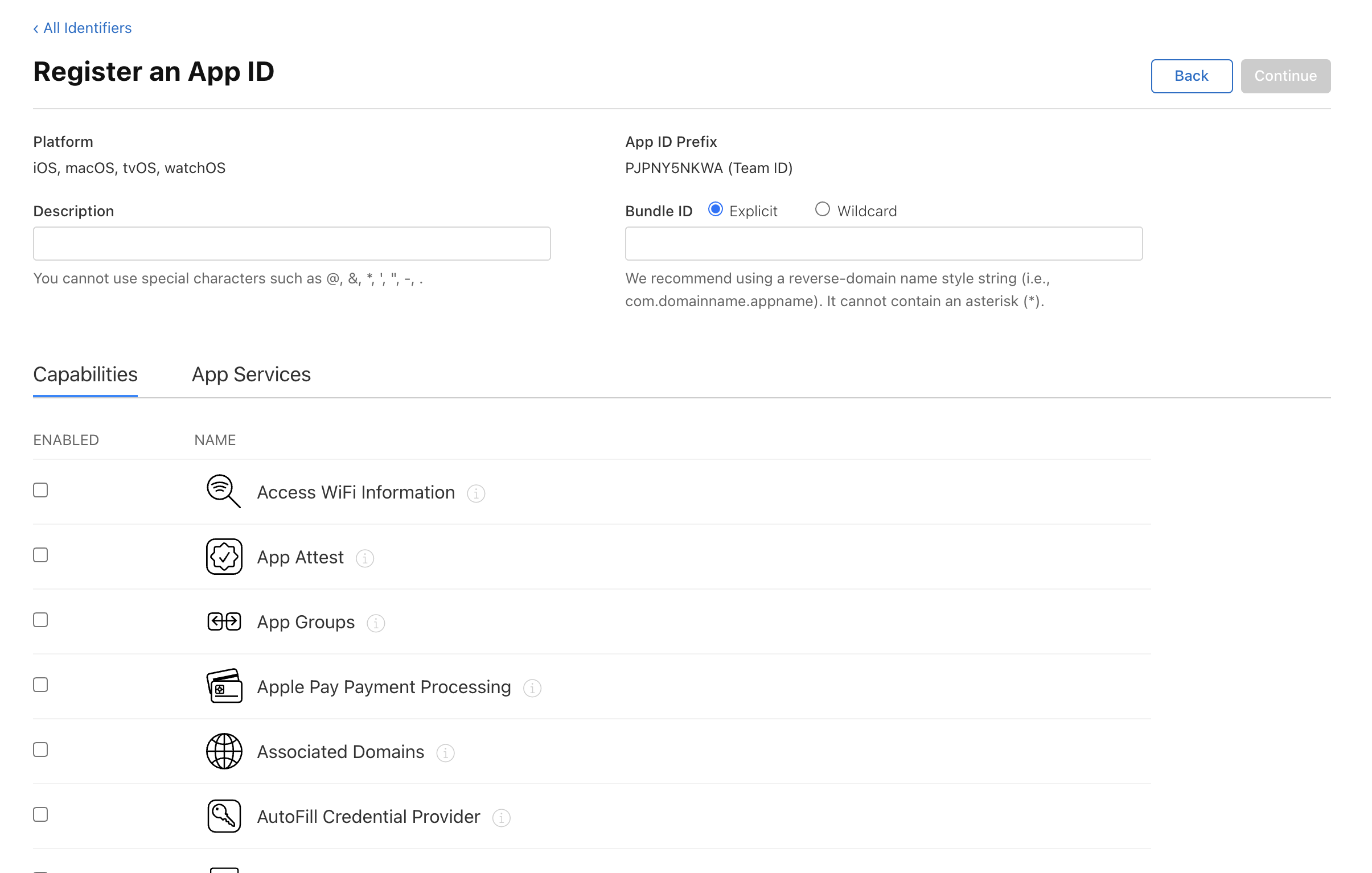 여기서 Description에는 자신이 알아볼 수 있는 앱 이름(실제 앱스토어에 뜨는 이름이 아닌, 단순 ID 관리를 위한 이름), Bundle ID에는 'com.companyname.appname'와 같은 형식으로 되어있는 개발하고 있는 앱의 ID를 적어줍니다.