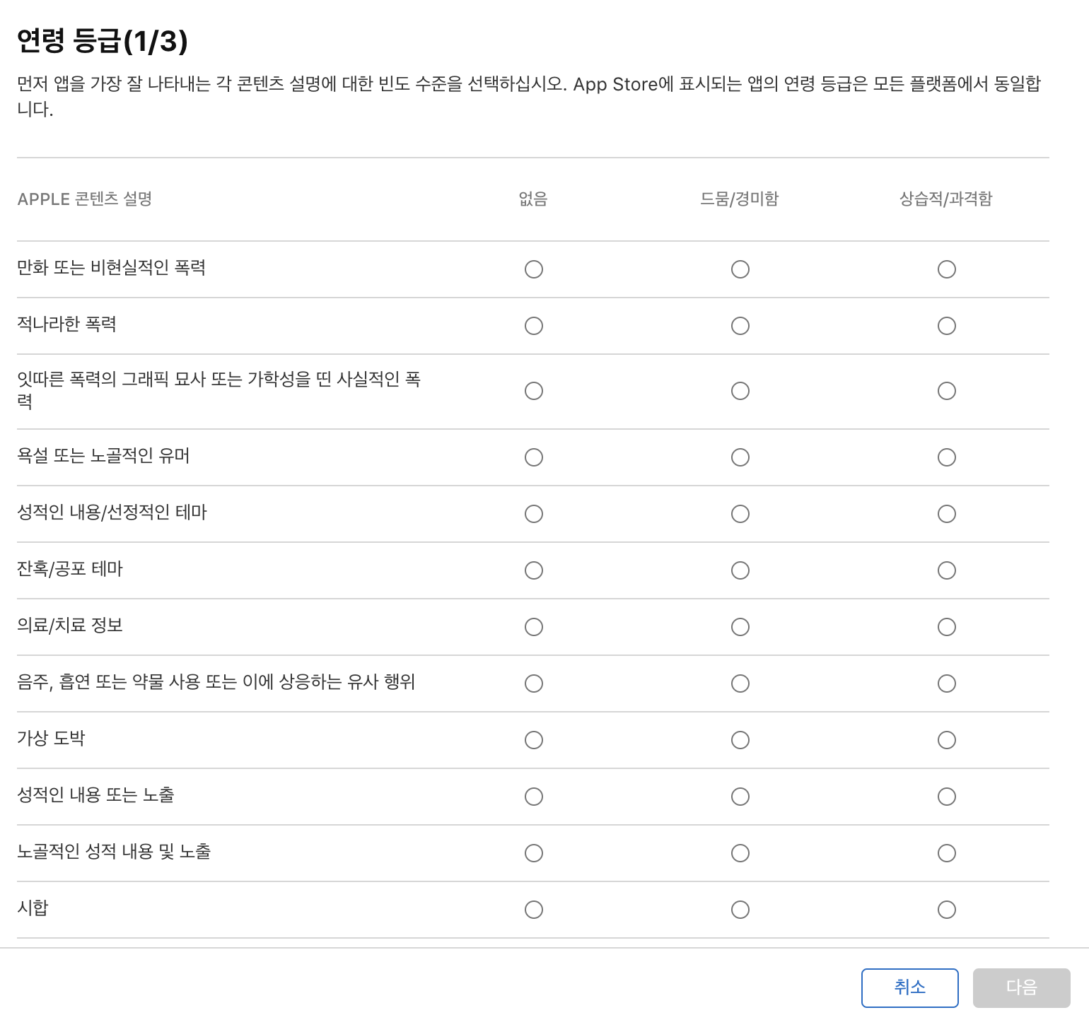 '모든 플랫폼에서 연령 등급 설정' 버튼을 누르면 다음과 같은 창이 뜨면서 앱에 어떠한 컨텐츠가 있는지 고르게 됩니다. 모든 체크박스를 선택 후에 완료를 누르면 자동으로 연령 등급이 산정되어 앱스토어에 표시됩니다.