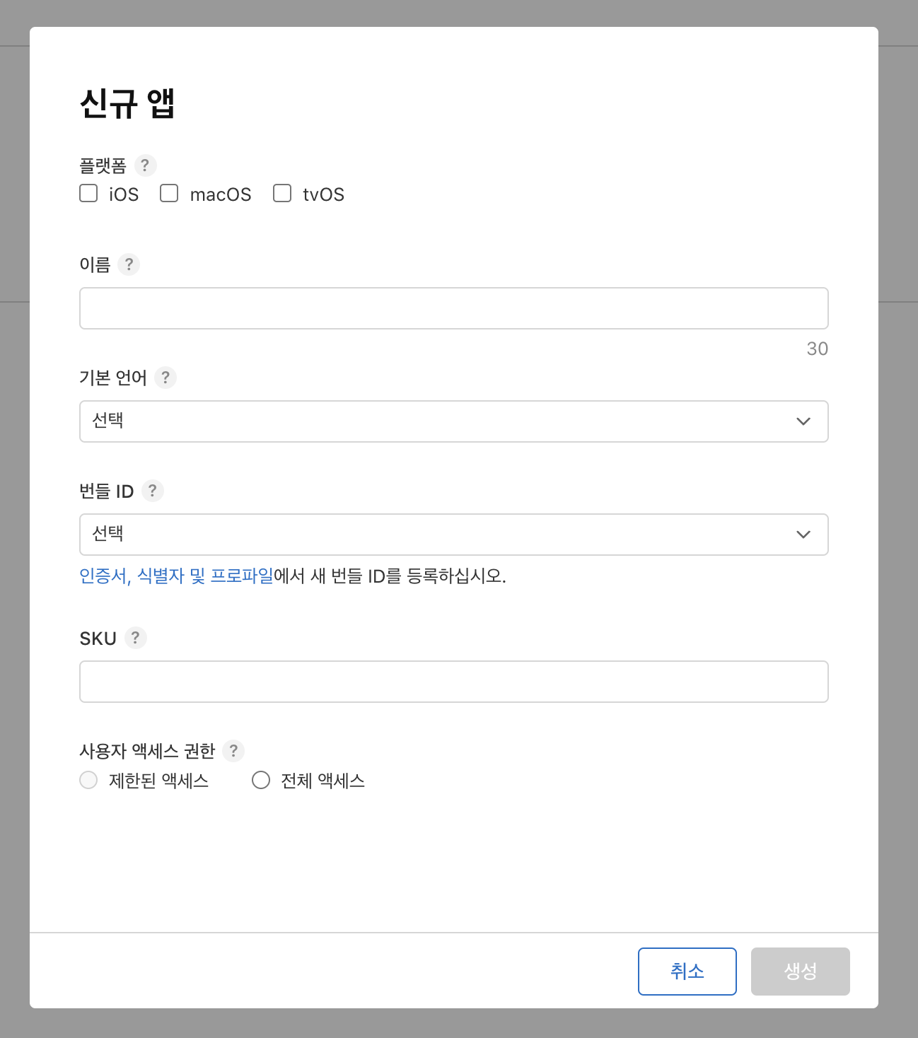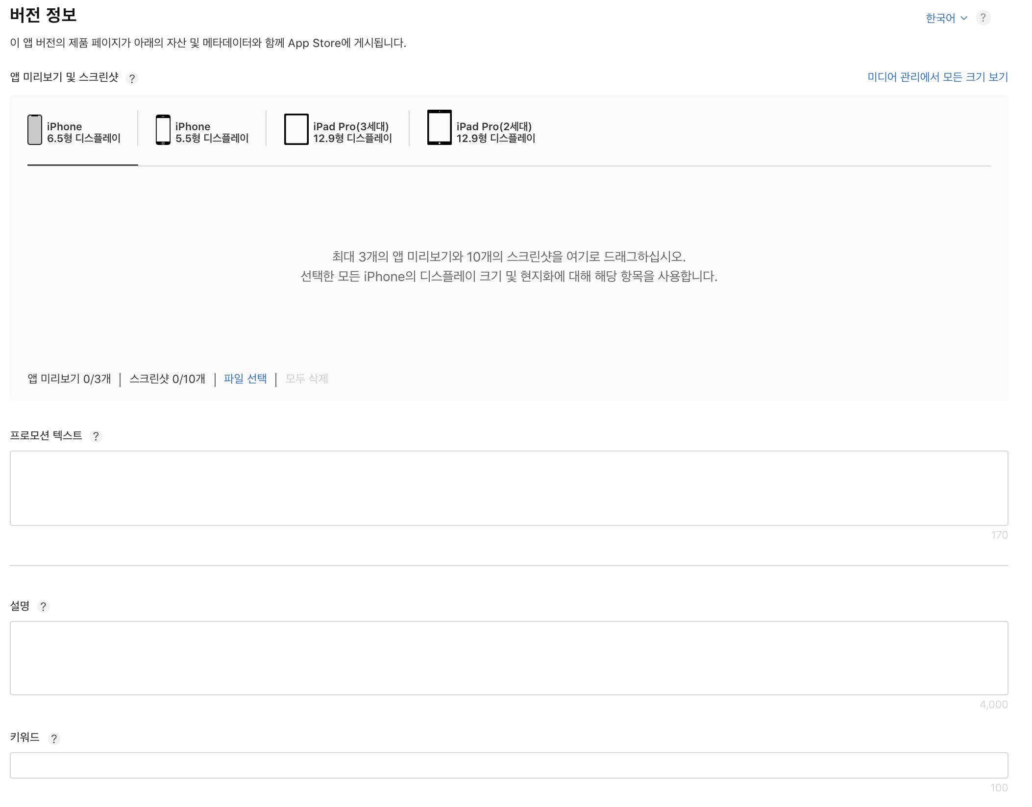 - 플랫폼: 어느 앱 스토어에 출시할 것인지 선택합니다. 복수 선택할 수 있으며, 아이폰에 출시할 경우 iOS만 선택하시고 지나가시면 됩니다. * iPadOS와 watchOS에 출시하실 경우에도 iOS를 선택하시면 됩니다.