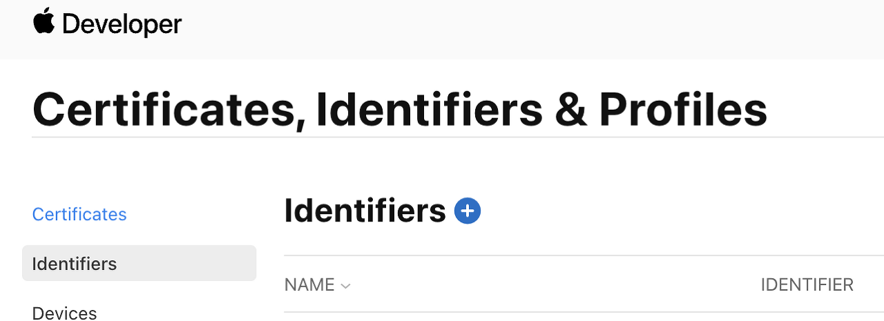 들어가게 되면 사이드바에서 'Identifiers'을 클릭한 후 왼쪽 상단에 떠있는 파란색 + 버튼을 눌러줍니다.