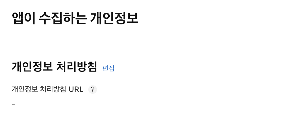 들어 간 후 '편집'이라 써있는 버튼을 눌러 서비스의 개인정보처리방침을 추가해주셔야 합니다.