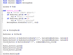 라디오 선택 버튼 넣어보기(Radio Button) 안녕하세요! 도치입니다. 이번에는 윈도우에 라디오 버튼, 즉 선택 버튼을 넣어보도록 하겠습니다. 우리가 컴퓨터를 사용하고 프로그램들을 사용하다 보면 버튼이용해서 선택을 하는경우가 많이 있는데요. 이럴때 쓰는 것이 바로 선택 버튼입니다. 전문 용어로 '라디오 버튼'이라고 합니다. 먼저 코드를 한번 보도록 하겠습니다. 먼저 str과 Radiovar변수 설정을 해줍니다. 이 변수들은 추후 라디오 버튼 인식과 알림창텍스트에 활용됩니다. 라디오 버튼 코드는 먼저 원하는 이름 = Radiobutton()을 해줍니다. 소문자 대문자에 꼭 유의하며 써주세요. 이것때문에 안되는 분들이 많습니다. 그다음 괄호 사이에 텍스트와 variable=Radiovar과 valuse..