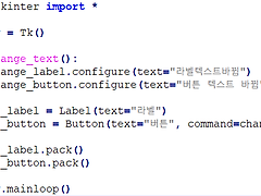 안녕하세요! 도치입니다. 이번에는 configure()함수로 라벨과 버튼의 텍스트를 바꿔보도록 하겠습니다. 프로그램을 만들다 보면 사용자의 조작에 따라 라벨과 버튼의 텍스트를 바꿔야 할때가 있는데요. configure()함수로 텍스트를 바꿔보도록 하겠습니다. configure()함수로 텍스트로 바꾸는 것을 사용하는 방법은 대체적으로 2가지가 있습니다. 첫번째 방법은 코드에서 텍스트를 지정해서 바꾸는 방법이고, 두번째는 사용자가 입력한 텍스트를 받아서 바꾸는 방법입니다. 먼저 첫번째 방법입니다. 코드는 이렇게 됩니다. 이 코드는 먼저 텍스트를 바꿀 라벨과 버튼을 만든후 버튼을 클릭하면 change_text함수가 실행되어 함수 속에있는 configure()명령어가 실행되게 만들었습니다. 자 한번 확인해볼까요..